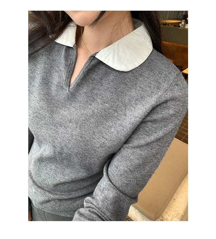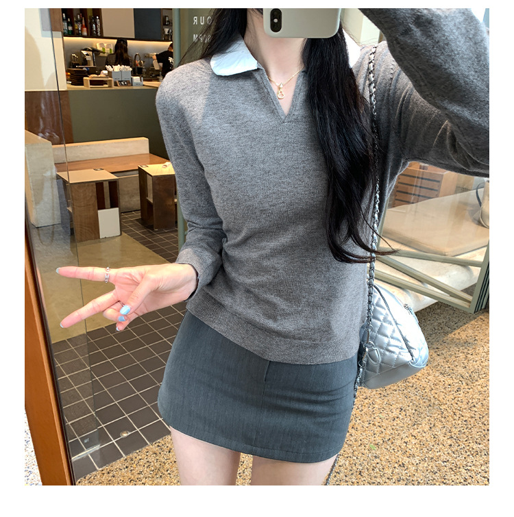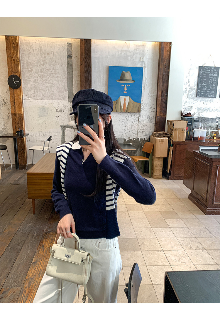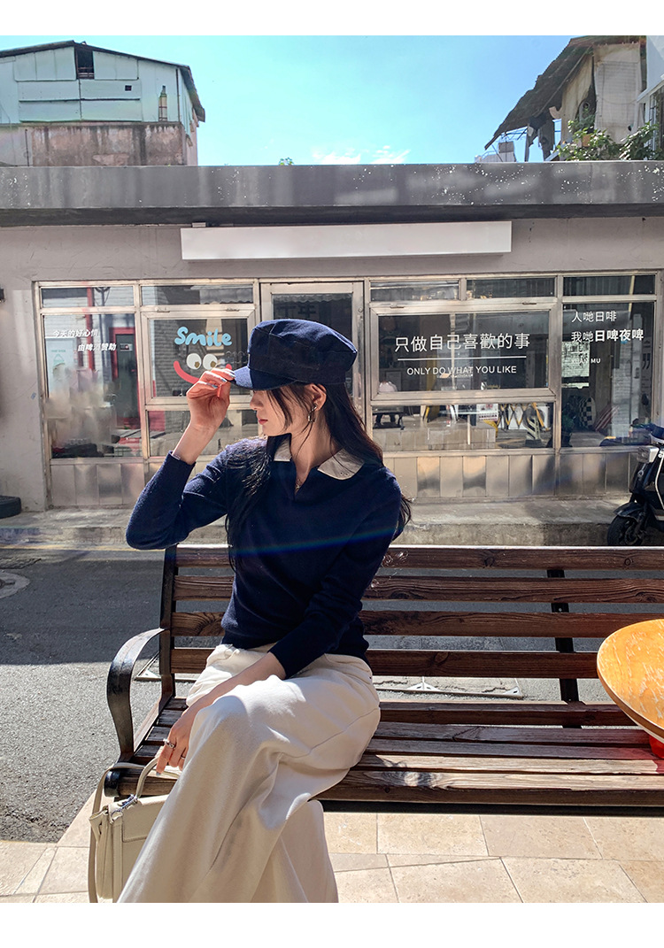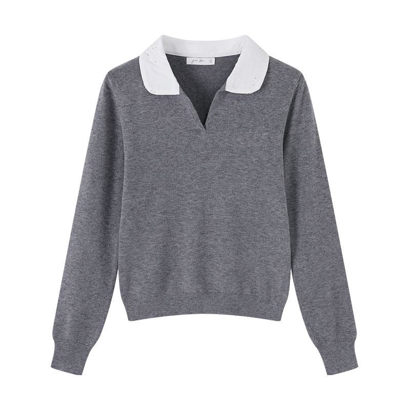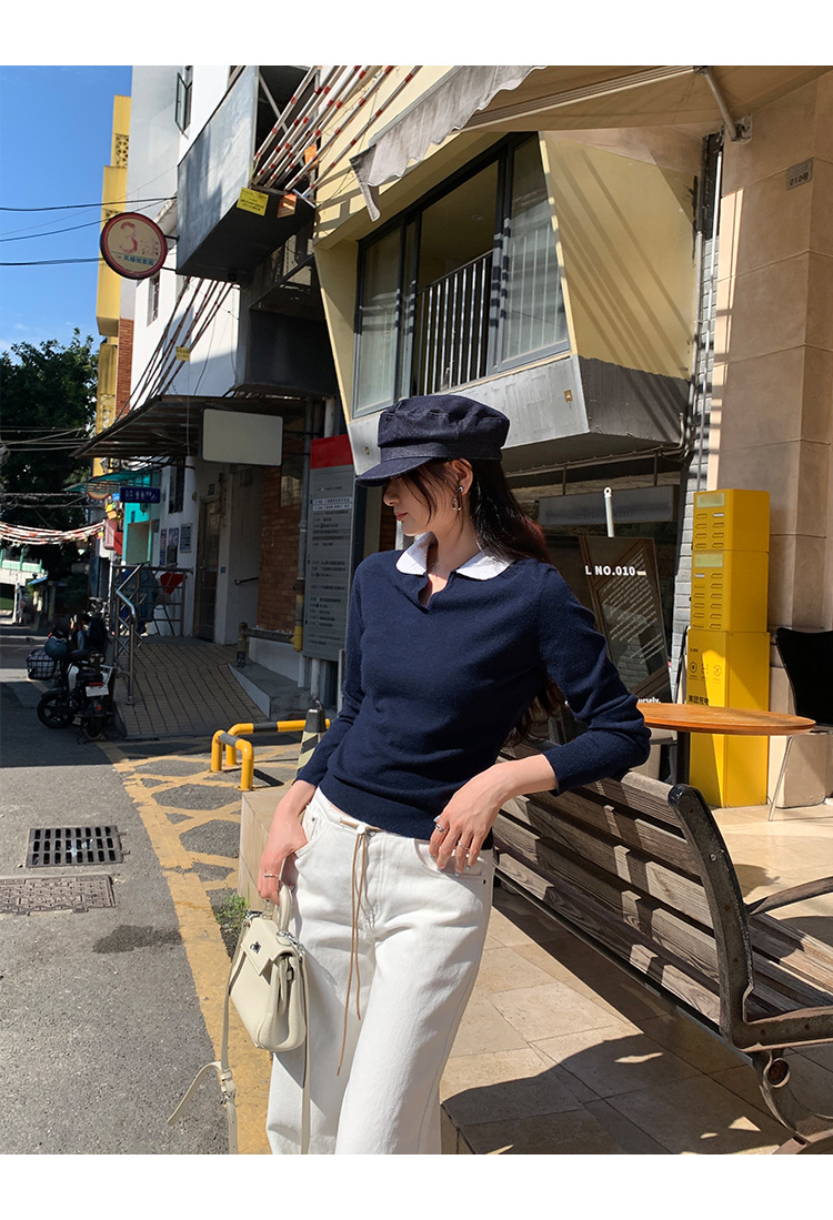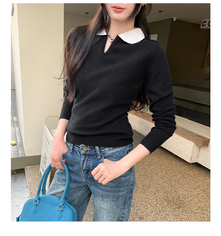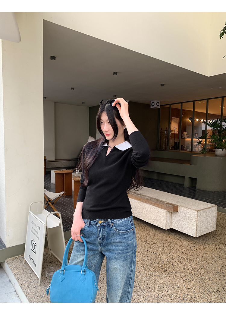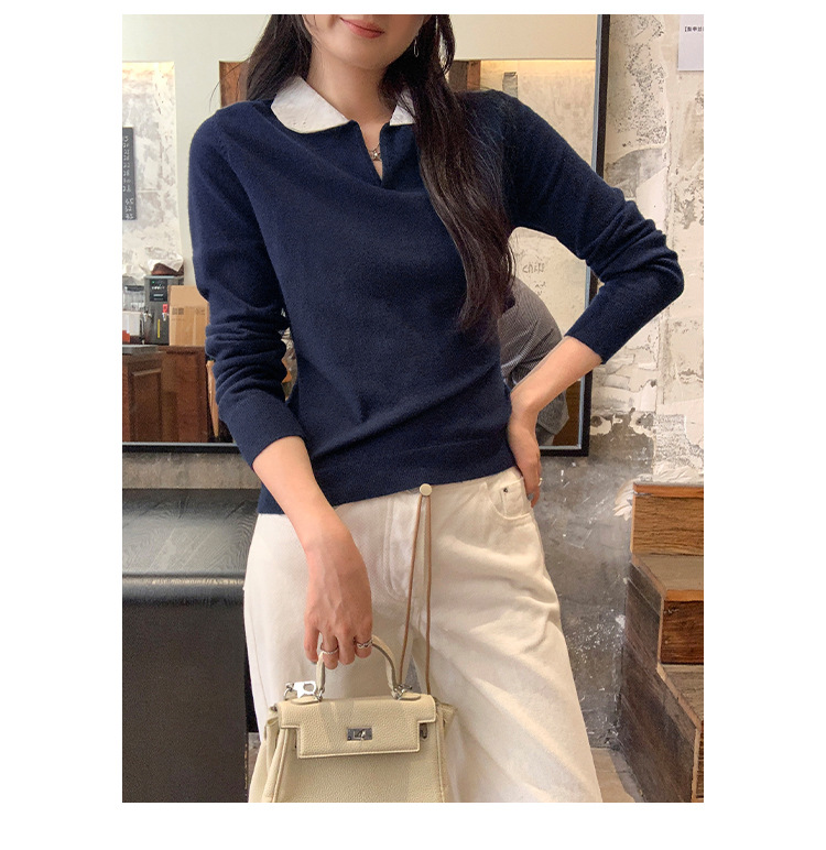 College Color-block Polo Neck Knit Top for Women